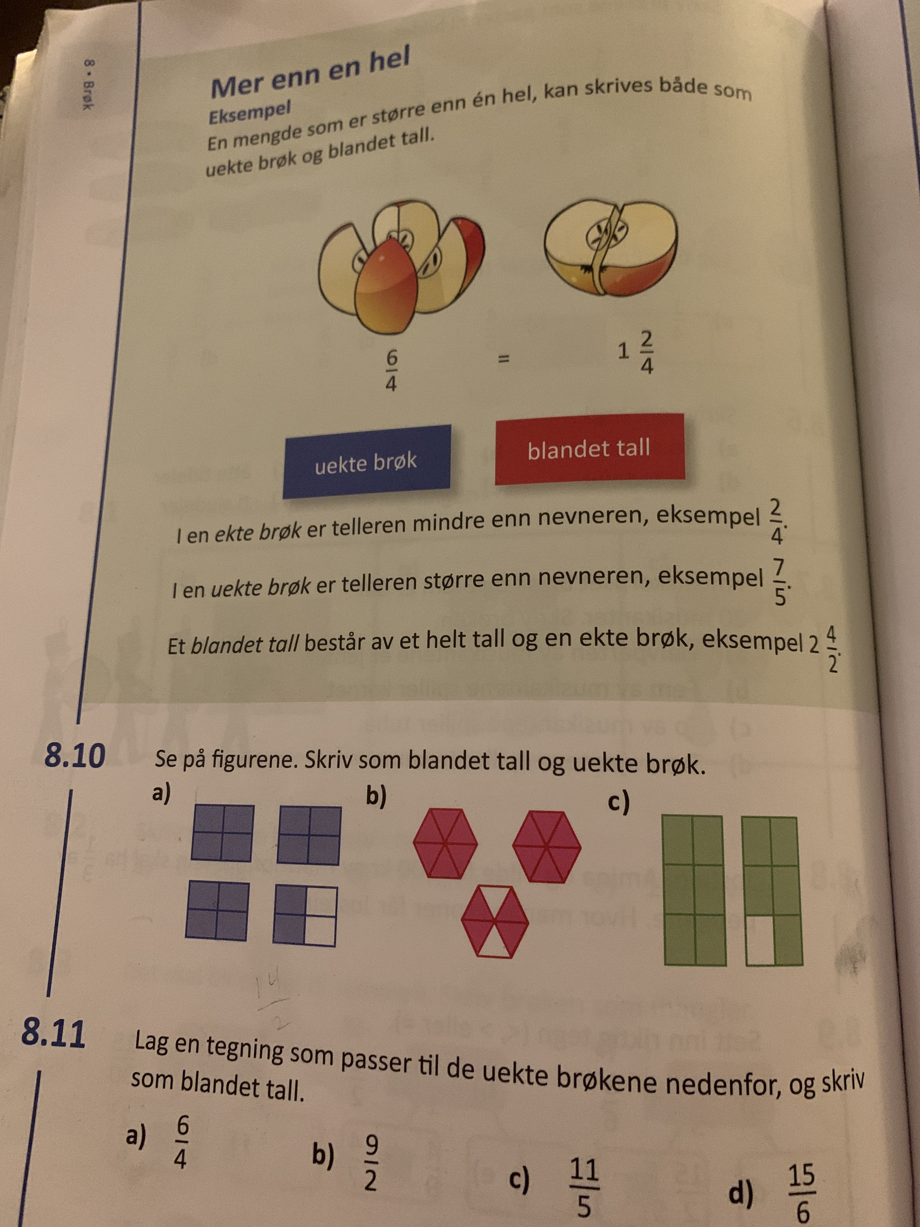 Anonym bruker Skrevet 8. desember 2021 #6 Skrevet 8. desember 2021 Blandede tall er en kombinasjon av hele tall og brøk. Uekte brøk er når teller er høyere enn nevner: 8.10a) 3 2/4 og 14/4 Anonymkode: b5469...e88